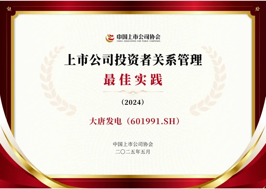 本網訊?近日,中國上市公司協會在北京發布“中國上市公司2024年度投資者關系管理最佳實踐”評選結果,大唐發電憑借在投資者關系維護、投資者回報、信息披露與公司規范運作等方面的優異表現,首次獲評“上市公司投資者關系管理最佳實踐”。