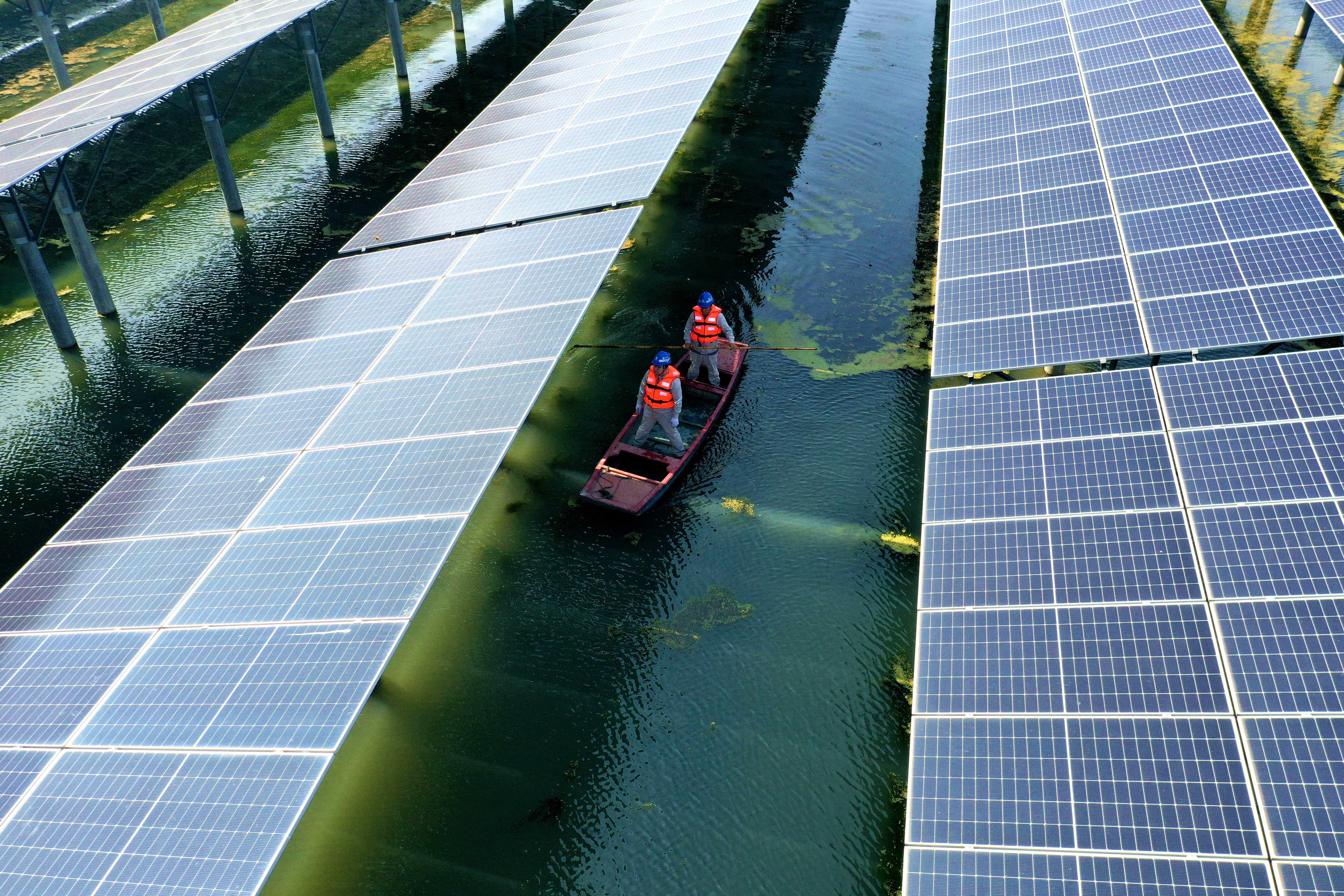 “靠近看看。”張威撐著船往陣列深處去。越往里,通道越窄。兩側樁基像兩堵墻夾著船,稍有不慎就會刮到組件邊框。他手里的竹篙左右點著,一點點蹭進去。