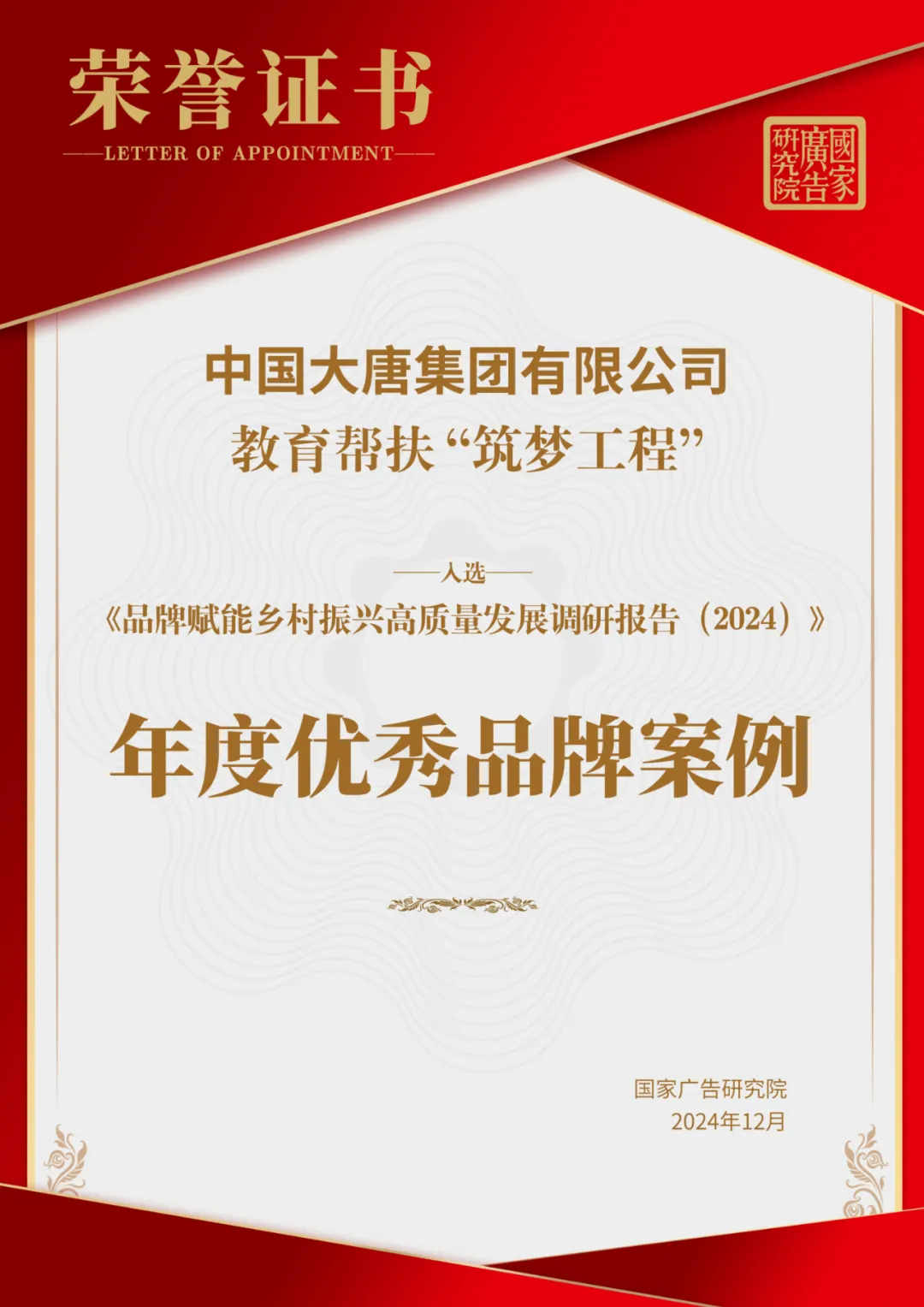 近日,由中國廣告協會指導,國家廣告研究院與新華網鄉村振興研究院聯合主辦的《品牌賦能鄉村振興高質量發展研究報告(2024)》發布暨鄉村振興品牌發展評價指標體系論證會在京舉行,會上發布了2024年度優秀品牌案例。憑借在品牌賦能鄉村振興工作中的突出表現,《中國大唐教育幫扶“筑夢工程”》入選年度優秀品牌案例。